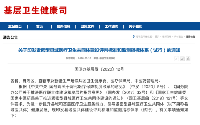 9月18日,國家衛(wèi)健委基層衛(wèi)生健康司發(fā)布《關(guān)于印發(fā)緊密型縣域醫(yī)療衛(wèi)生共同體建設(shè)評(píng)判標(biāo)準(zhǔn)和監(jiān)測指標(biāo)體系(試行)的通知》(以下稱《通知》),指出將進(jìn)一步提升縣域和基層醫(yī)療衛(wèi)生服務(wù)能力,引導(dǎo)緊密型縣域醫(yī)療衛(wèi)生共同體(以下簡稱縣域醫(yī)共體)健康發(fā)展。
