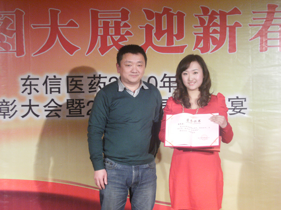 在過去的一年里,奮戰(zhàn)在各條戰(zhàn)線的東信人與公司同風(fēng)雨、共命運、用不懈的努力為公司的發(fā)展做出了自己的貢獻(xiàn)。一首深情的《回家》之后,晚會進(jìn)入東信醫(yī)藥2010年度總結(jié)表彰大會的激情時刻。公司總經(jīng)理陳向先生及銷售部、業(yè)務(wù)管理部、市場部、商務(wù)部的主要領(lǐng)導(dǎo)揭曉了“東信醫(yī)藥2010年度總結(jié)表彰大會”的各個獎項,向贏得榮譽和尊重的先進(jìn)團(tuán)隊和先進(jìn)個人頒發(fā)了獎品和證書。