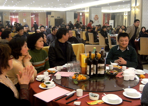 2011年的1月27日是中國傳統(tǒng)的小年夜,武漢荔灣美食城張燈結(jié)彩、鼓樂齊鳴。門外的漢口鬧市街頭也是燈光璀璨,令人眼花繚亂的燈飾、景觀紛紛亮相,將節(jié)日里的江城裝扮得更加美麗迷人。在一派喜慶、祥和的氣氛中,從市場一線歸來的營銷將士和總部各職能部門的干部職工共150人歡聚一堂,舉杯同慶,共同回顧、總結(jié)2010年度的工作,表彰先進(jìn),迎接新春佳節(jié)的到來。