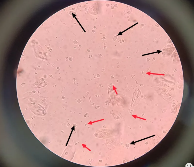 在顯微鏡下,最引人注意的是運動活潑的陰道毛滴蟲(簡稱滴蟲),見下圖黑色箭頭,但是旁邊的白細胞并沒有按常規(guī)出牌(增多),反而在正常范圍內(平均一個視野6~8個白細胞),只能給清潔度打上Ⅱ度。出于日常檢驗工作的細心,再加上這種凝膠狀白帶不可能沒有真菌,于是檢驗醫(yī)生多看了幾個視野,終于發(fā)現(xiàn)了零零散散的真菌(白色念珠菌),見下圖紅色箭頭。