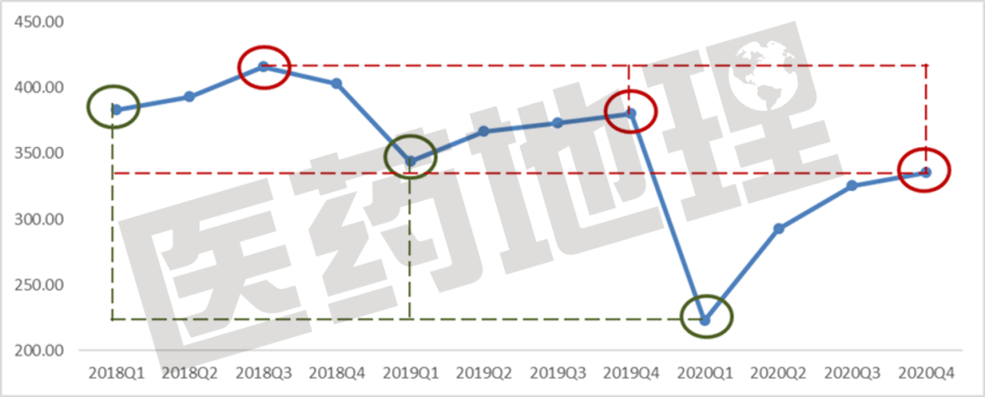 2020年共實(shí)現(xiàn)銷售額1176億元,相較于2019年大幅回落近20%。具體來(lái)看,2020年1季度創(chuàng)下了2013年以來(lái)的低點(diǎn),雖然從Q2開始一路爬升,但直到Q4也未達(dá)到前兩年的單季度最低值。自2013年起,中藥市場(chǎng)規(guī)模不斷擴(kuò)大,至2017年達(dá)到峰值,在2018年平穩(wěn)過(guò)渡后,2019年出現(xiàn)小幅下降,歷經(jīng)2020年疫情最低點(diǎn)后,預(yù)計(jì)2021年將會(huì)緩慢回升,但短期內(nèi)無(wú)法達(dá)到另一個(gè)高點(diǎn)。