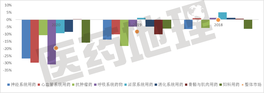 2020年,統(tǒng)計(jì)當(dāng)前的TOP8治療領(lǐng)域增長(zhǎng)情況后發(fā)現(xiàn)(以中藥主治疾病的治療大類計(jì)),受整體市場(chǎng)影響,僅有骨骼肌肉用藥出現(xiàn)了極微弱的增長(zhǎng),而其他領(lǐng)域都是負(fù)增長(zhǎng),但程度有所不同,有4個(gè)領(lǐng)域的降幅在市場(chǎng)均值以上(抗腫瘤、泌尿、消化、婦科),僅有2個(gè)領(lǐng)域在近三年的增速均高于市場(chǎng)均值(泌尿、消化)。而神經(jīng)系統(tǒng)用藥作為市場(chǎng)份額第一的治療類別,近三年的增速均低于市場(chǎng)均值。