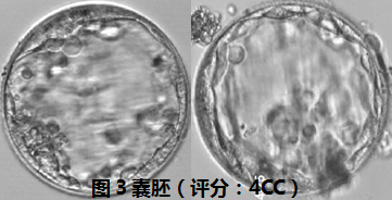 正常發(fā)育的胚胎會(huì)在第5或第6天形成囊胚;囊胚由內(nèi)細(xì)胞團(tuán)及滋養(yǎng)外胚層兩群細(xì)胞構(gòu)成,通常用于移植的囊胚至少一群細(xì)胞的評(píng)分≥B級(jí)(細(xì)胞數(shù)量較多),見圖2。兩群細(xì)胞數(shù)量均很少的評(píng)分均為C級(jí)的囊胚因其成功妊娠幾率小,在有其他胚胎可供選擇時(shí)通常選擇廢棄,見圖3。