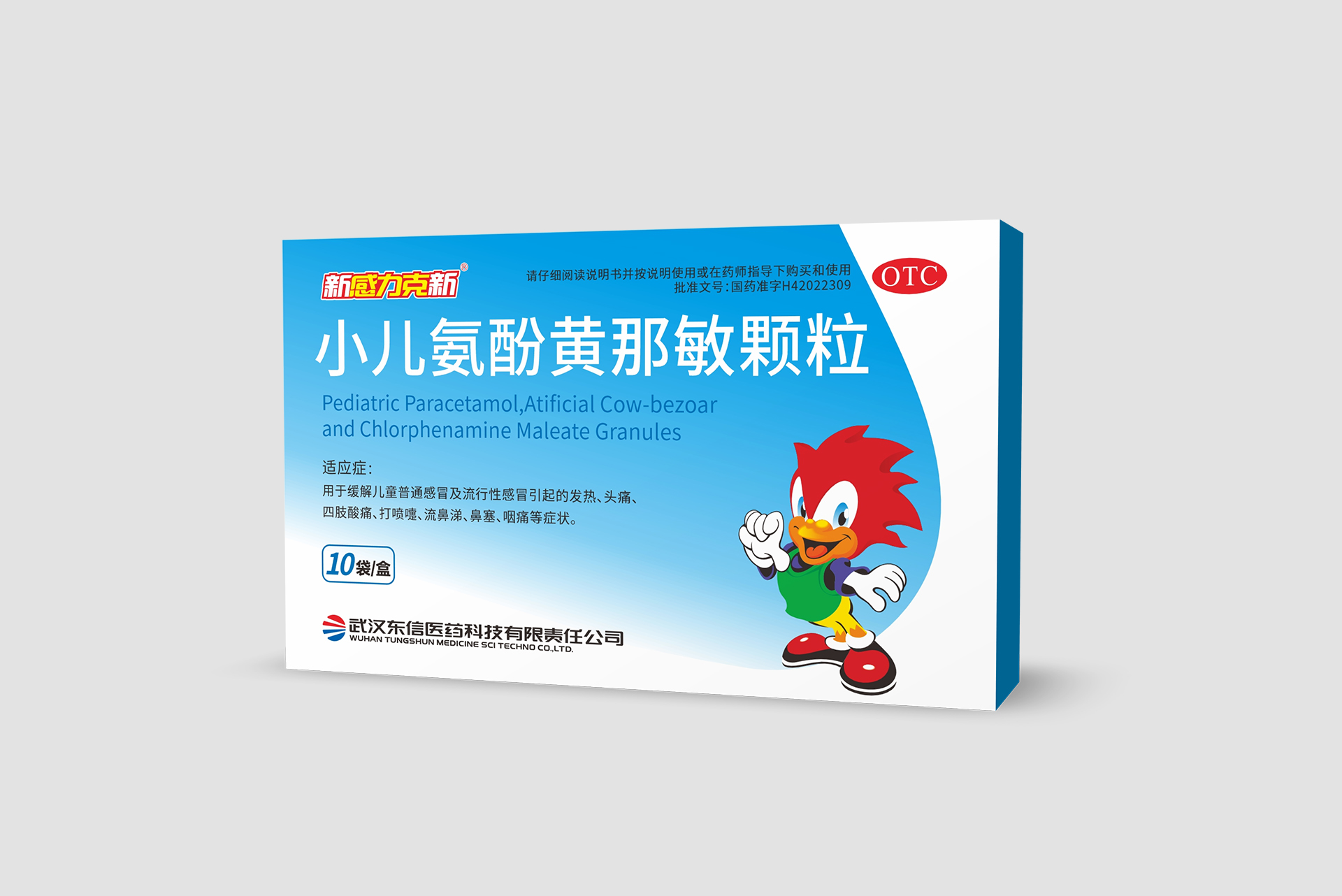 【規(guī)格】每袋含對乙酰氨基酚125毫克,馬來酸氯苯那敏0.5毫克,人工牛黃5毫克。